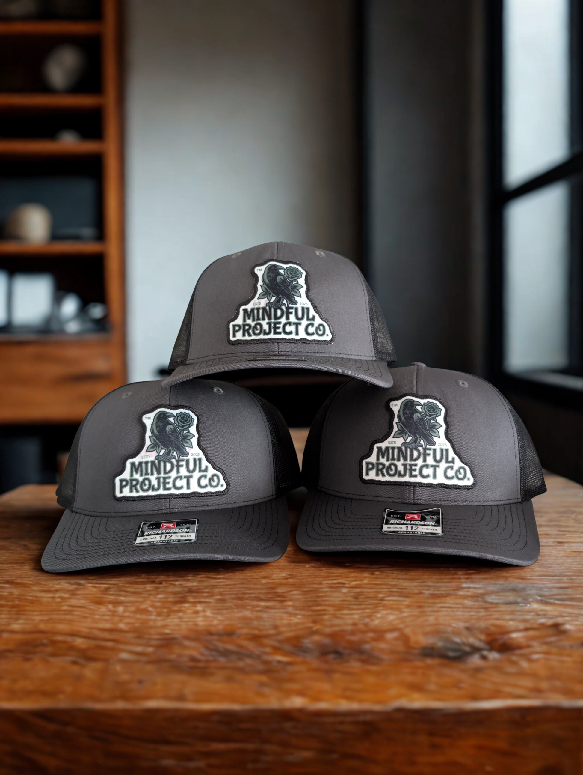 MindfulProjectCO signature Raven logo patch on a trucker style hat for everyone who enjoys a classic curved snapback
